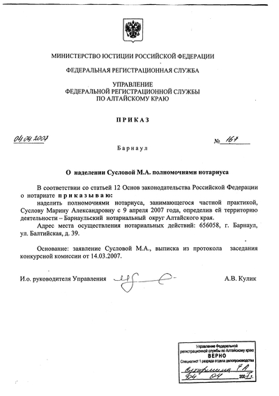 Приказ Управления Федеральной регистрационной службы по Алтайскому краю "О назначении Сусловой М.А. на должность нотариуса, занимающегося частной практикой" № 167 от 4 апреля 2007 г.