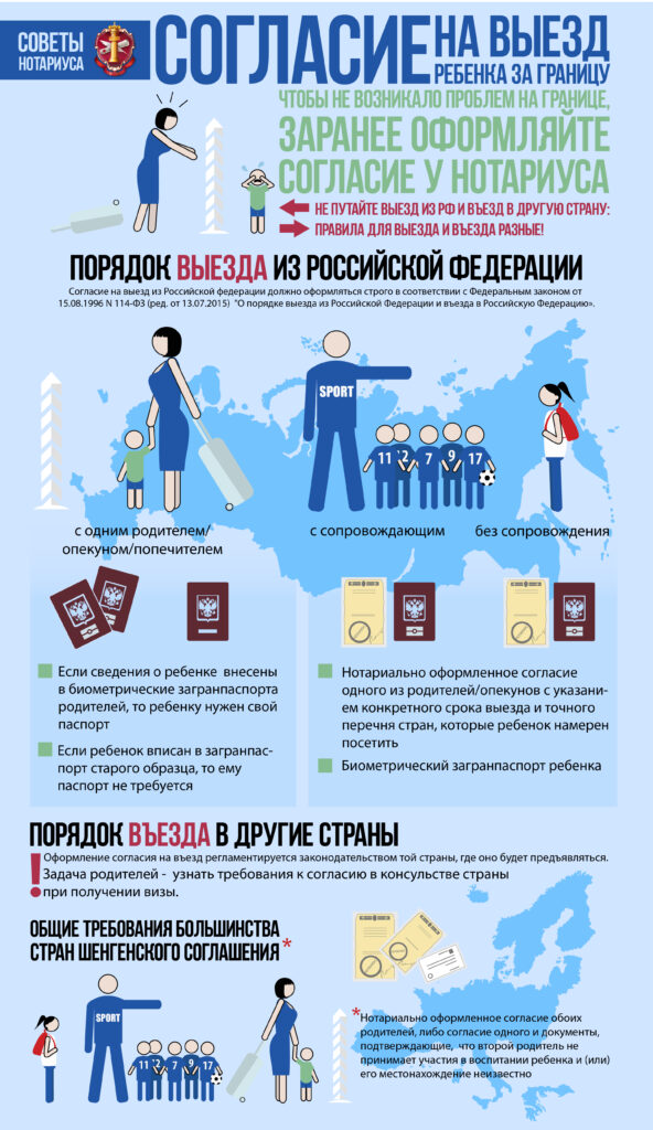 По законам Российской Федерации, если несовершеннолетний гражданин (лицо, не достигшее 18-летнего возраста — ред.) выезжает из страны вместе с хотя бы одним из родителей, усыновителей, опекунов или попечителей — согласия на выезд ребенка за границу от второго родителя не требуется. Важно не забывать, однако, что речь идет только о выезде ребенка из Российской Федерации, а не о въезде в другую страну. Есть два вида согласий: есть согласие родителей на выезд ребенка, которое предназначается для предъявления сотрудникам пограничной службы Российской Федерации, оно должно оформляться строго в соответствии с федеральным законом о порядке выезда из РФ и въезда в РФ; второй вид – согласия, которые требуют консульские учреждения и посольства для оформления визы ребенка. Как будет оформляться согласие для получения визы, регламентируется законодательством той страны, куда оно будет предъявляться.